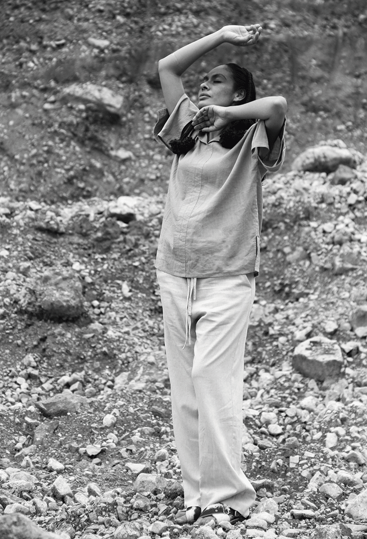 Es una pieza elaborada en lino con una silueta holgada y divertida, sus mangas cuadradas dan énfasis a esta prenda.