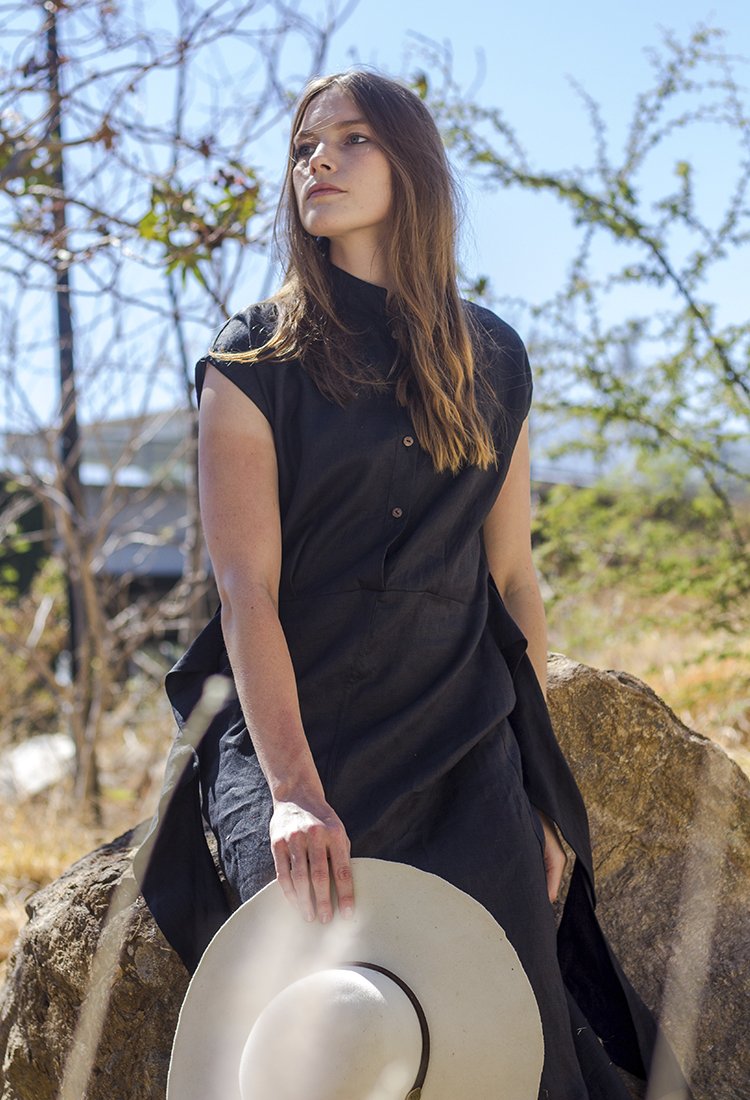 El vestido LAR esta confeccionado con lino. Es una pieza divertida y elegante por sus escarolas que cuelgan de los costados.